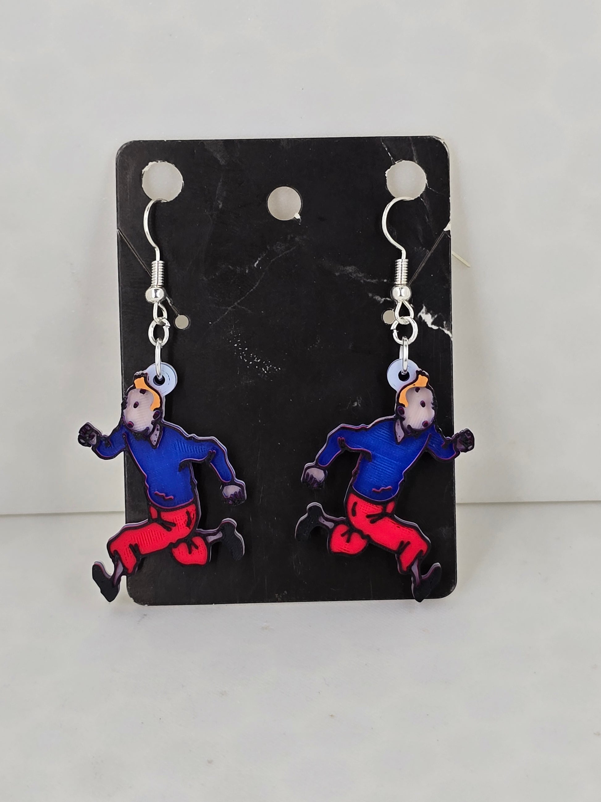 - 3D printed earrings featuring Tintin in a running pose