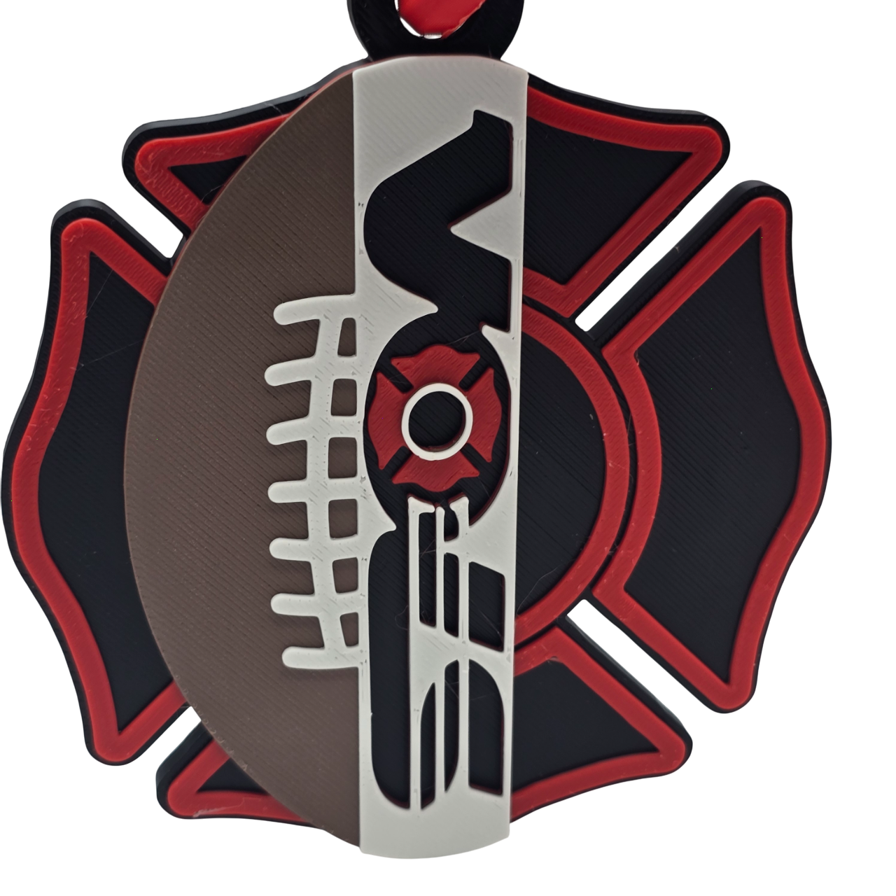 Design: Oversized, multi-layered pendant combining the Maltese Cross and a football.